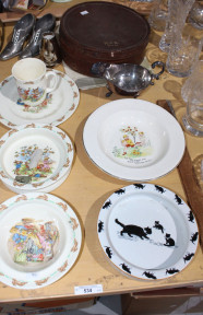 incl. Royal Doulton Bunnykins, Grimwades Cats & Winton, an old leather collar box, pair of antique English silver plate, shoe forms originally old pin cushions, silver plate jug, Royal Winton vase, old newspaper -