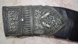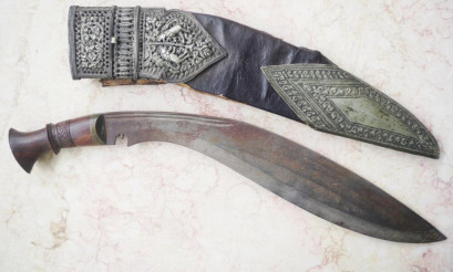 leather covered sheath, (worn), with embossed silver decoration, kukri with carved wood handle, (length 44cm approx). -