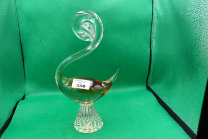 Lot Description:Murano Italy art glass amber and clear swan pediment on base