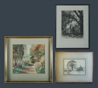 Edith TOMS, Path to the Cottage, Watercolour (24x26cm); J H GAMBLE, "Milson's Point in 1891," pen & ink (12x17cm); & Gayfield SHAW, "PLC Building (Old School, Croydon)" 1947, etching signed in the plate only (23x18cm) (3) -
