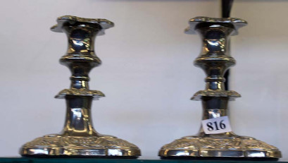 Lot #816 - A Pair of English Silver Plated Candlesticks