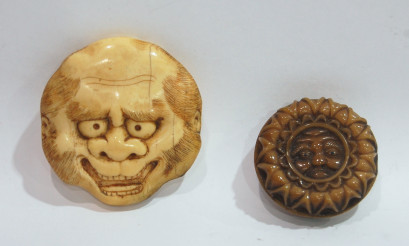 Lot #432 - Two Japanese Netsukes, the Circular form of a Manju, Ivory Demon Mask & an Amber Material with a Face in the Centre, Meiji Period