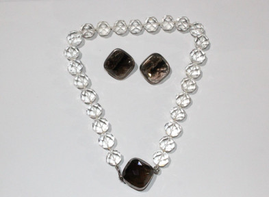 comprising of 26 round faceted rock crystals strung with knots, featuring a central smoky quartz silver framed pendant, bead dimensions 14.3-15.6mm, total length of beads 26cm, along with a pair of silver smoky quartz stud earrings, quartz dimensions 25.3 x 24.3mm approx. -