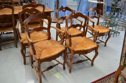 Lot Description:Five French Louis XV style beech framed arm chairs with rush seats (5)