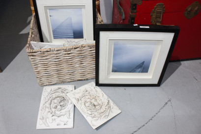 40cm square x 28cm deep, also comes with 4 x wall hung plaques with floral design, 27cm tall x 20cm wide, plus 2 framed artworks lake scenes, black box frame, 21cm square -