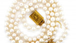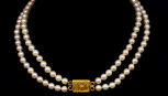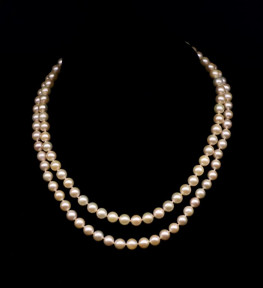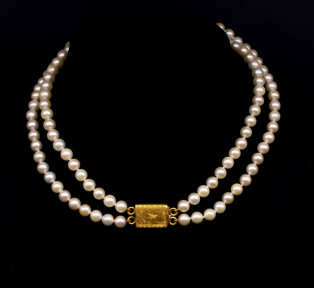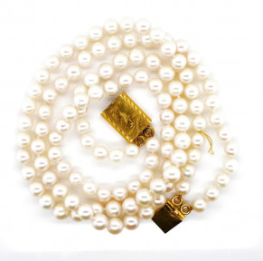 with a Victorian 15ct yellow gold clasp and a aesthetic movement engraving of a bird. Approx 112x 7mm-7.5mm cultured white pearls, length 42cm. Valuation available -