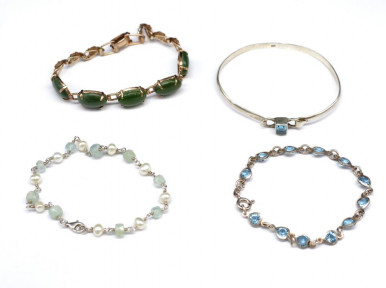 three of pieces are marked 925 silver. Gemstones include topaz, pearl and aquamarine as well as green agate. Approx bracelet length 18cm -