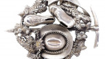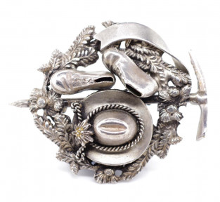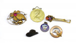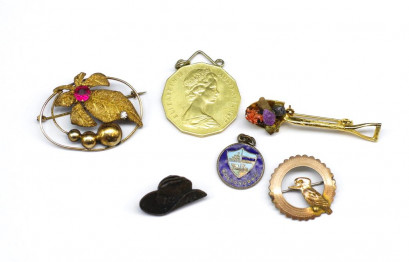includes silver plate miners brooch, a 9ct rose gold front kookaburra brooch, a costume jewellery miners brooch, a enamel medal, a ANZAC slouch hat pin, as well as 9ct silver lined brooch. -