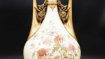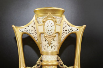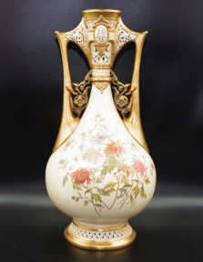 hand painted floral decoration, pierced decoration to top and base, decorative dual handles, gilt highlights, marked to base and # 1064, (height 46cm approx). -