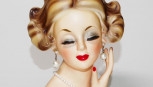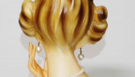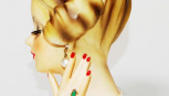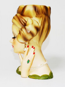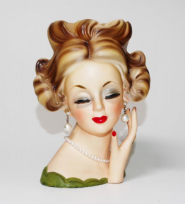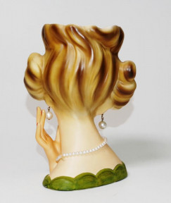 wearing faux pearl necklace and earrings, (height 18cm approx). -