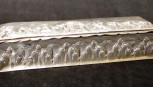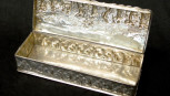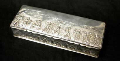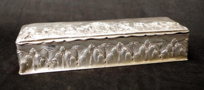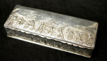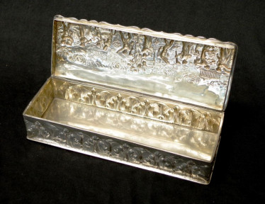 hallmarked Chester 1902, maker: George Nathan & Ridley Hayes, with repousse traditional Greek scene top, width 22cm X depth 8cm X height 4.5cm, 357grams approx -