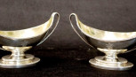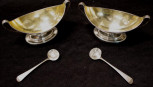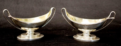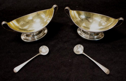London 1789, makers John Wakelin and William Taylor, each dual handled, with gilt washed interior, crested, together with 2 condiment spoons, including London 1820, makers (possibly) William Esterbrook, and London 1811, makers Jonathan Wallace and Thomas Hayne. (Weight 128grams approx, each salt; total weight including spoons, 278 grams approx). -