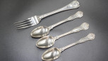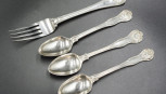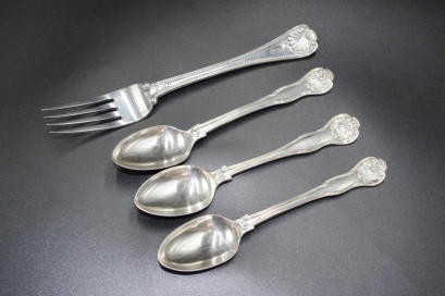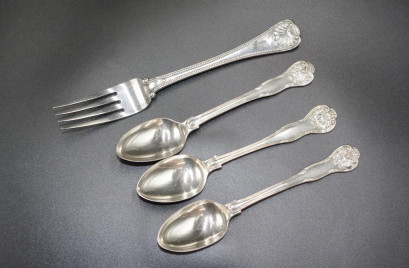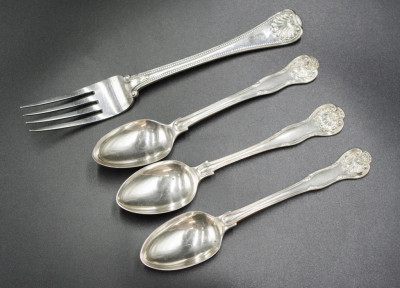 each with London hallmarks, circa 1840s, (date marks rubbed), maker John James Whiting (2), (weight 104grams approx, total); together with a Victorian sterling silver dinner fork, London 1896, makers Holland, Aldwinckle & Slater, (length 18cm; weight 68grams approx). -