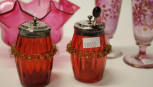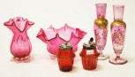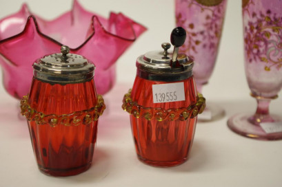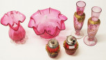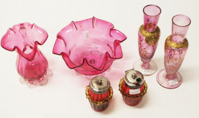 to include a sugar & creamer, salt pot and pepper shaker, together with 2 Bohemian pink vases with handpainted gilt decoration -