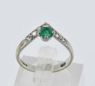 set with seven brilliant cut diamonds of approx. 0.15ct in total and a round cut emerald, set in 9ct yellow gold. Size J. Weight 1.9g. -