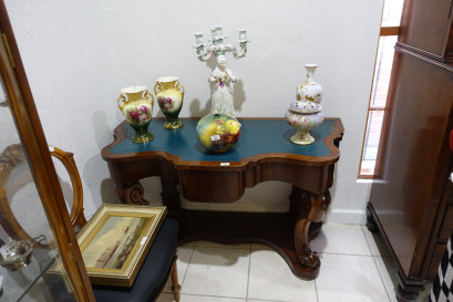 with scroll front legs, tooled hide top, converted to a desk, width 122 cm
