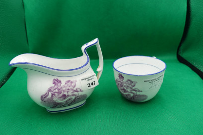 Lot #247 - Teacup and cream jug with Puce transfer and blue rim, circa 1800