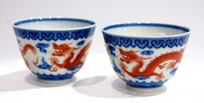 Lot Description:A Pair of Dragon Cups, the Iron Red Dragons Chasing the Flaming Pearl above a Band of Waves, Qianlong Seal Mark