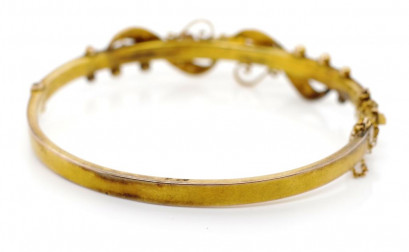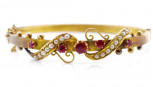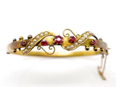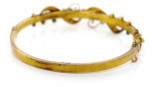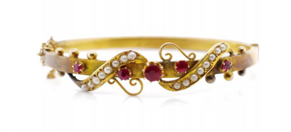 set with seed pearls and red paste. Marked 9 crown lion to tang possibly for Brunkhurst or Steiner?. With swivel hinge and safety chain. Approx weight 7.9 grams, inside width 58mm -