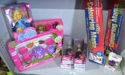 4 x various 'Monster Girl' dolls, a dancing princess doll, 2 x fashion tea play sets, 2 x colouring mania series sets by Texta, and text bands in box by Hallmark, all as new, all with original price tags etc. -