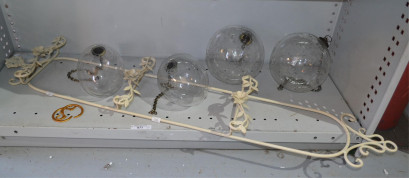 two round, each with hanging chain etc., and a white painted metal wall shelf for hanging plated etc. -