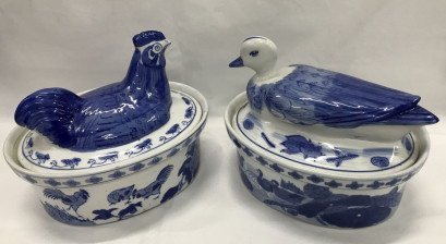 Lot Description:A Pair of Blue & White Lidded Tureens, one with a Duck the other a Hen