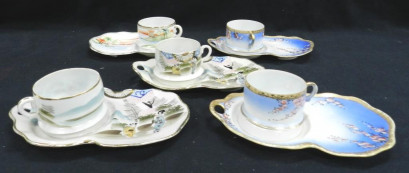 Lot #631 - Five Fine Porcelain Japanese Handpainted Tea Cups & Saucer Plates, mid 20th Century