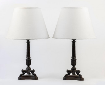 Lot Description:Two bronze column lamps with shades