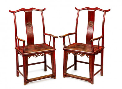 Lot Description:A pair of Chinese red lacquered elm yoke back chairs