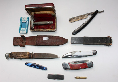 pocket knives, small bowie style knife, cut throat razor and a safety razor. -