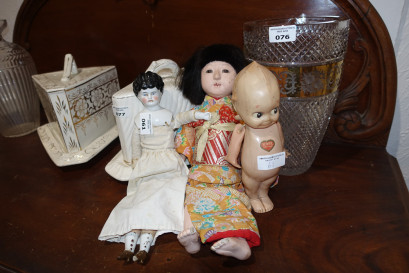 porcelain boots and hands, height 35 cm, early Japanese doll with black hair and composition face, hands and feet, jointed body and silk clothing, height 38 cm, early Kewpie Sons of Venus celluloid doll, height 23 cm -