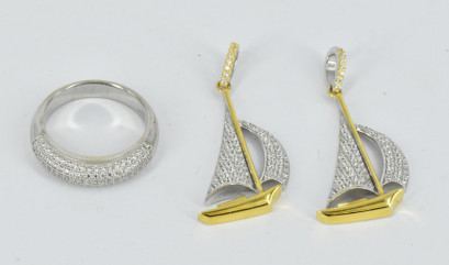 two 'boat' pendants and a ring, diamond imitation set on sterling silver. Size L-M. Weight 9.6g -