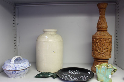 Lot Description:Shelf lot assorted items incl. vintage stoneware pot