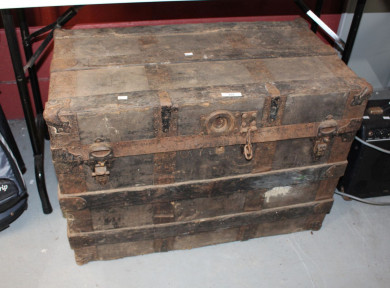 American made by Joseph A. Enzler, Dubuque Trunk Factory, Iowa, timber frame, canvas bound with timber and metal support strapping throughout, AF, 77 cm W x 54 cm T x 44 cm D -