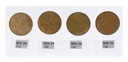 1878 Victoria young head, reverse St George gold sovereign. Mintmark M (Melbourne); 1881 Victoria young head, reverse St George gold sovereign. Mintmark S (Sydney); 1886 Victoria young head, reverse St George gold sovereign. Mintmark S (Sydney); & 1900 Victoria old head, reverse St George gold sovereign. No mintmark (London) -