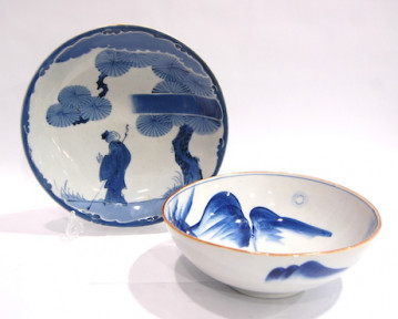 Lot #216 - A Japanese Blue & White Plate Painted with Scholar Under Pine Tree, a Big Japanese Bowl Painted with Fisherman in Underglaze Blue
