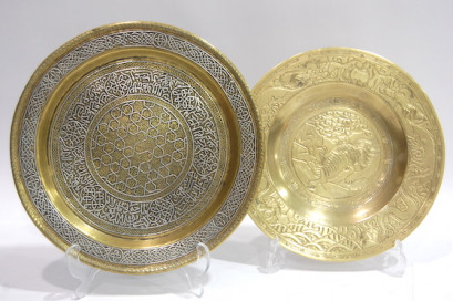 Lot #451 - A Persian Solid Brass & Silver Tray, Cast & Engraved with Bands of Calligraphic & Geometric Decoration, 19th/20th C.