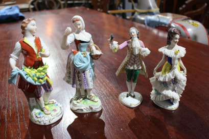 1 x pair of Dresden figures of a boy and a girl, the boy selling fruit, the girl with a basket; the other pair Continental porcelain figures, both with applied lace work, both pairs hand painted in an elegant costume; tallest pair 21cm T -