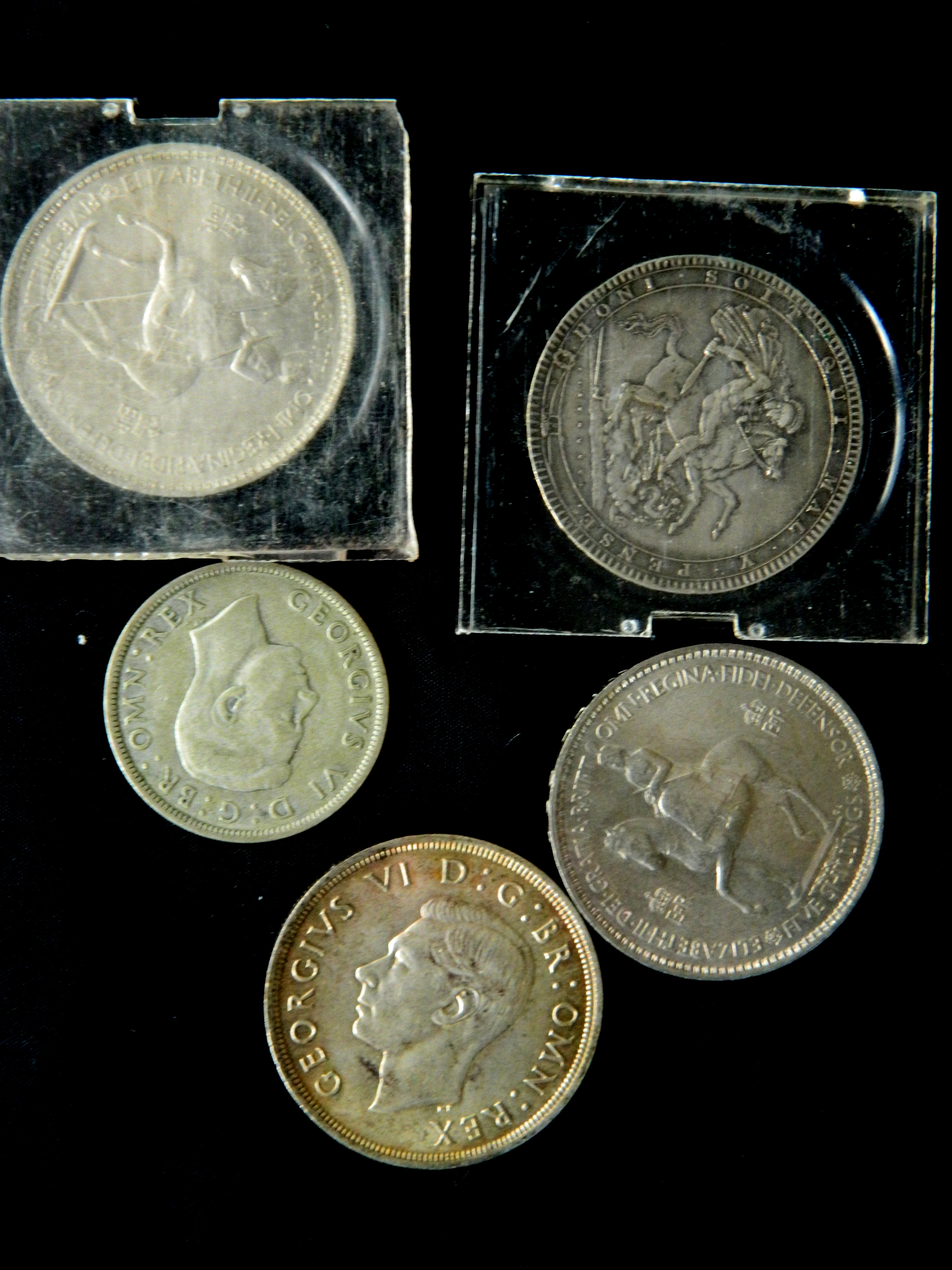 together with, 1937 English crown, 1938 half crown and two queen Elizabeth Queen Elizabeth II 1953 coronation five shilling coins -