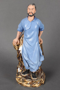 depicting a man standing by a rocky outcrop, with hands resting behind him, in tones of blue and brown, impressed mark to base, h 37cm -