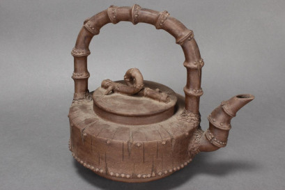in the form of bamboo with loop handle, on three bun feet, incised three character mark to base, h 22.5cm -