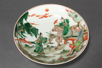 of shallow circular form, decorated with figure greeting musicians on horseback in a garden setting, in tones of green, orange and blue on a white ground, with floral sprays to exterior, six character mark to base, d 22cm -