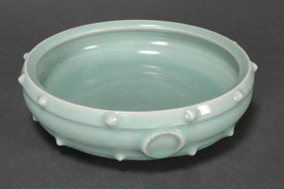 of circular form, in a blue/green glaze, on exposed circular foot, d 18cm -