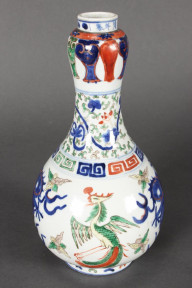 of garlic head form, decorated with frieze depicting dragon and phoenix, between key-fret and floral borders, in tones of green, blue, yellow and red on a white ground, six character mark to rim, h 22.5cm -