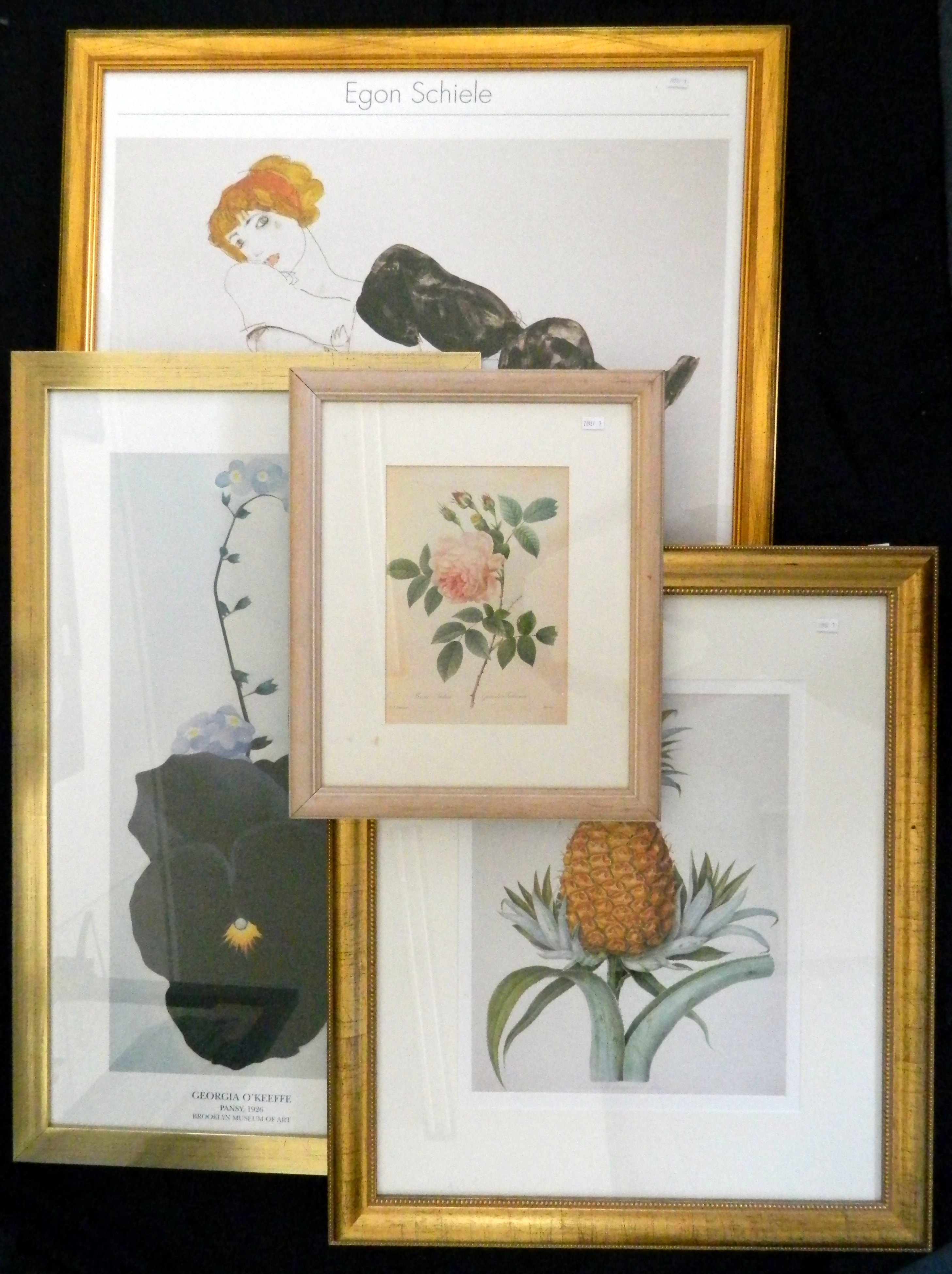 Lot #596A - 4 Framed prints including: Egon Schiele poster, Georgia O'Keefe, A Pineapple, Redoute Rose