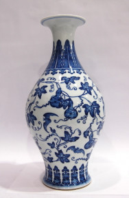 Lot Description:A Tall Chinese Blue & White Baluster Vase, a Pattern of Scrolling Vines & Pears, Yongzheng Mark to the Base