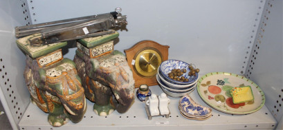pins dishes and plates, a pair of ceramic elephant stands AF, barometer made in Western Germany and a metal music stand -