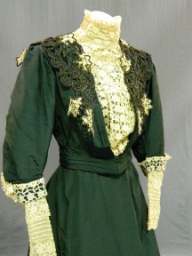 Lot Description:A bottle green Edwardian outfit with a bustle back train skirt and walking pleats to front,
