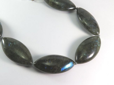 large navette labradorite beads with strong opalescent flashes; hook and ring clasp. Length 43cm. -