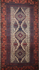 with triple pole medallion on a cream ground within repeating borders, in red tonings. 180 x 98cm. -